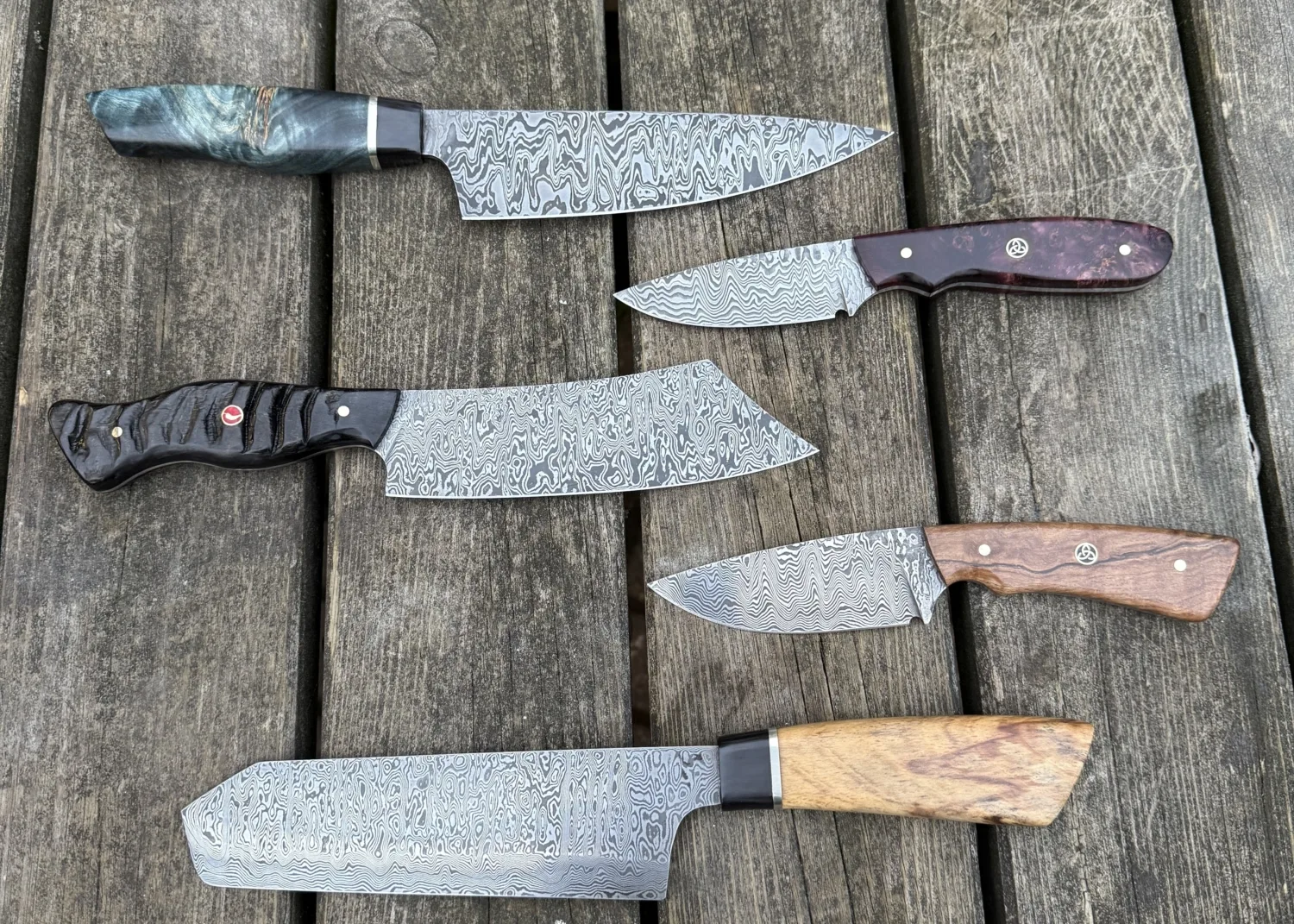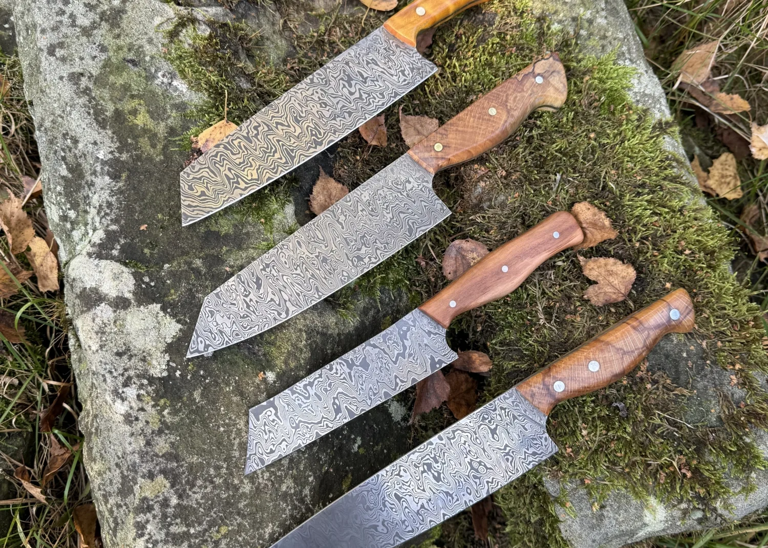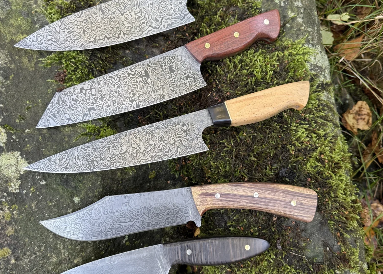 Welke cursus je ook kiest elk mes is altijd een unicaat. Naast het unieke damastpatroon is de eigenheid van het mes verder te versterken door de ruime materiaalkeuze waarmee het handvat gevormd kan worden. Inheemse en uitheemse houtsoorten en gestabiliseerde houtsoorten in een veelvoud aan kleuren. Ook hebben we fossiele materialen zoals mammoetkies en mammoetivoor op voorraad.
