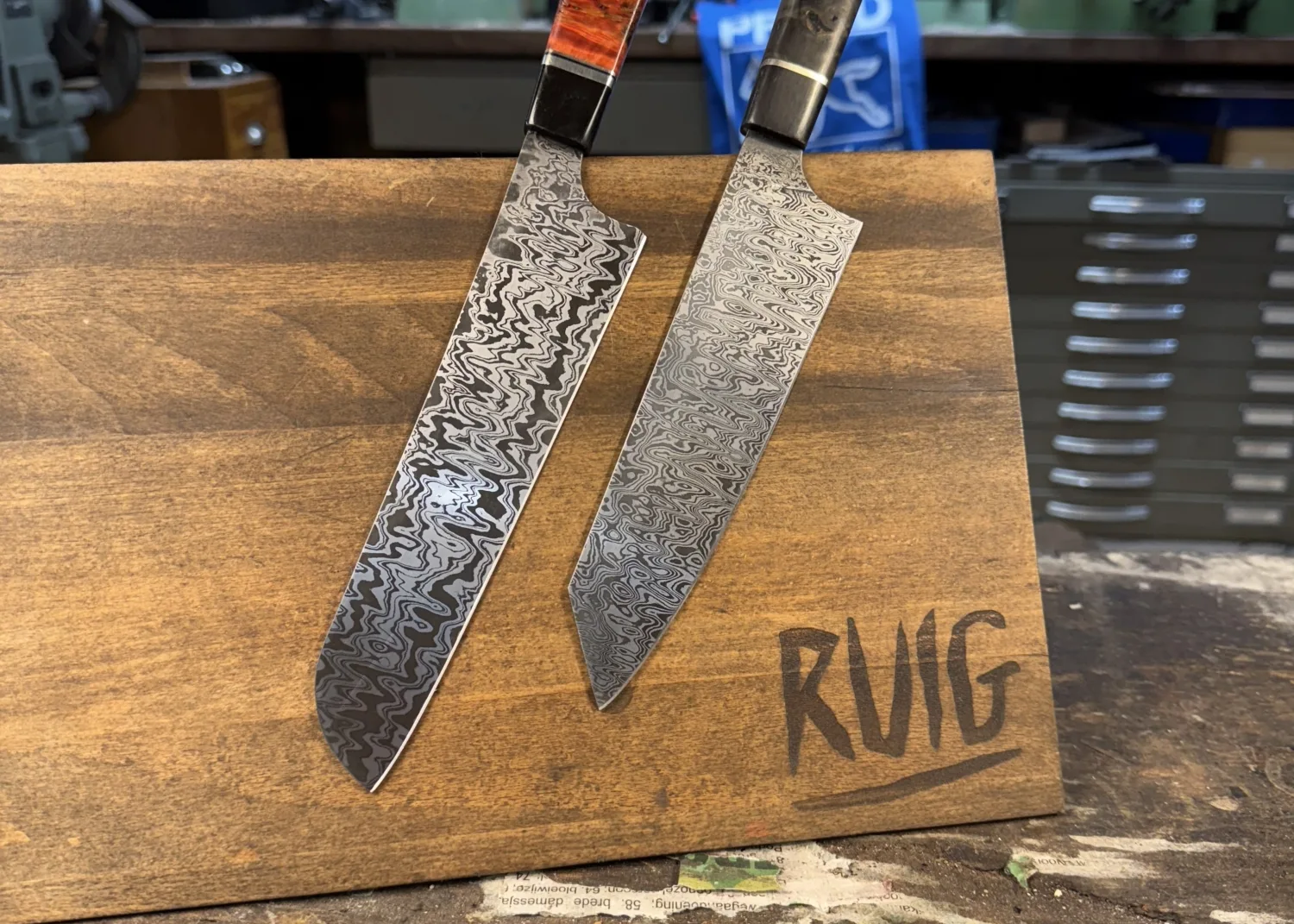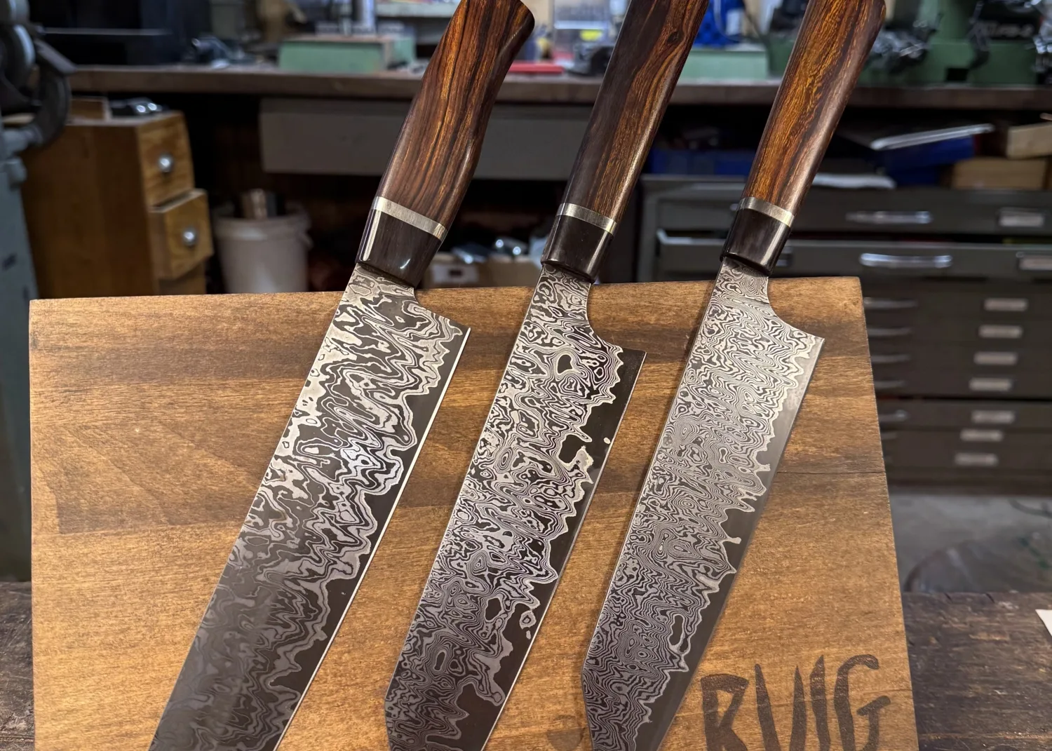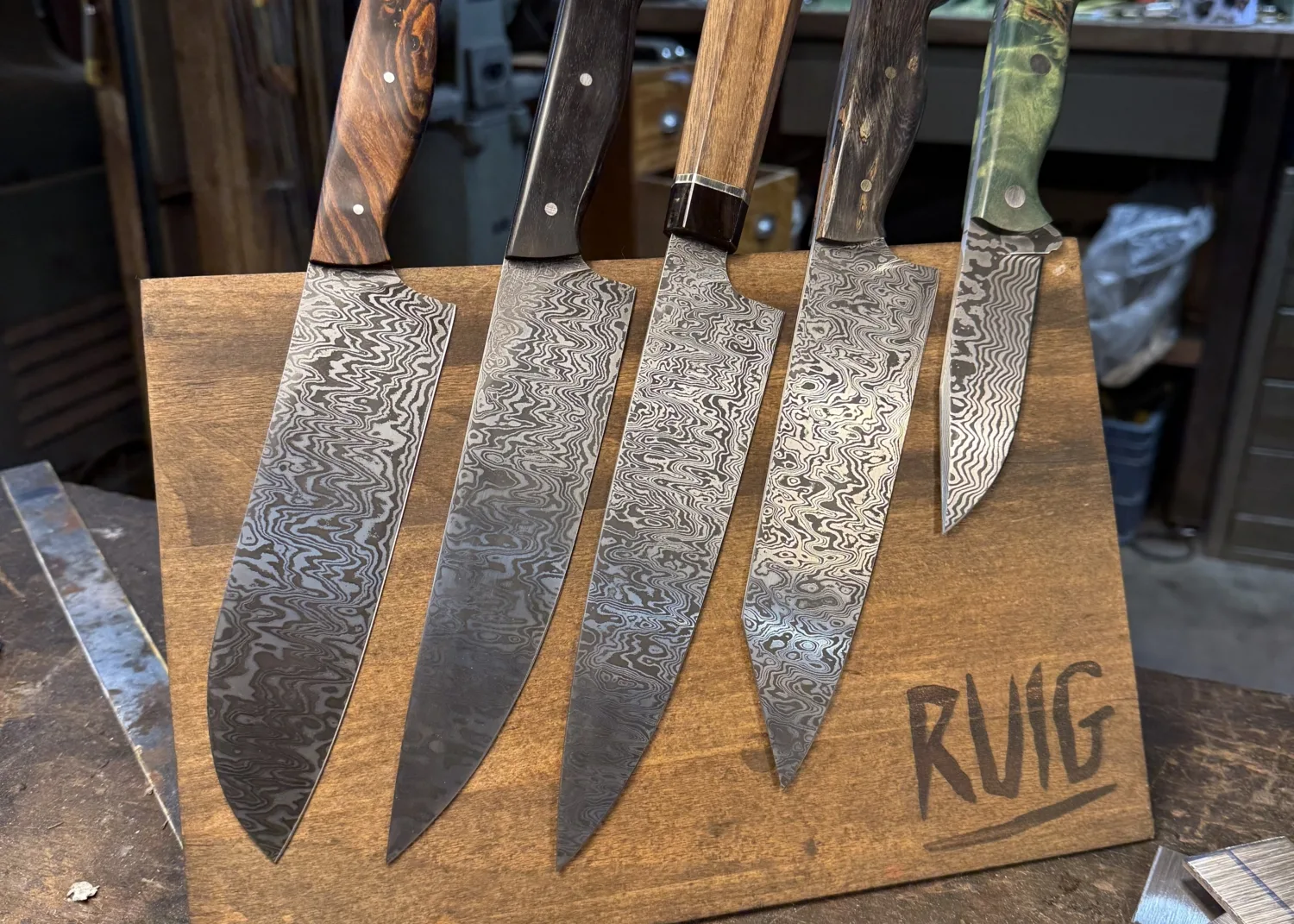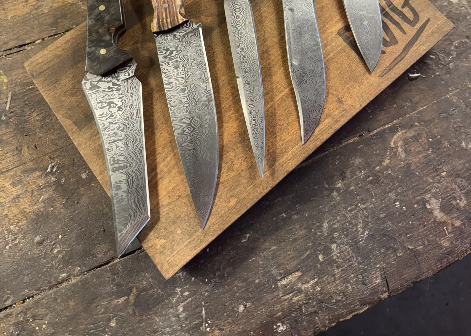 Welke cursus je ook kiest elk mes is altijd een unicaat. Naast het unieke damastpatroon is de eigenheid van het mes verder te versterken door de ruime materiaalkeuze waarmee het handvat gevormd kan worden. Inheemse en uitheemse houtsoorten en gestabiliseerde houtsoorten in een veelvoud aan kleuren. Ook hebben we fossiele materialen zoals mammoetkies en mammoetivoor op voorraad.