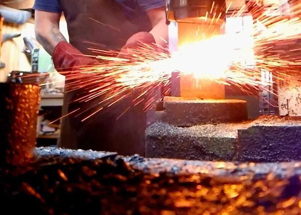 Daarna begint het echte werk en stelt u uw eigen damastpakket samen om deze vervolgens, met behulp van hamer, aambeeld en luchthamer te vuurlassen. Dit pakket vouwen we verschillende keren om te komen tot het gewenste aantal lagen. U beleeft het oude ambacht en de hitte die nodig is om staal te smeden. Het eindresultaat krijgt een laatste warmtebehandeling waarna het gedurende de nacht langzaam afkoelt zodat het de juiste materiaaleigenschappen heeft voor de volgende stappen.