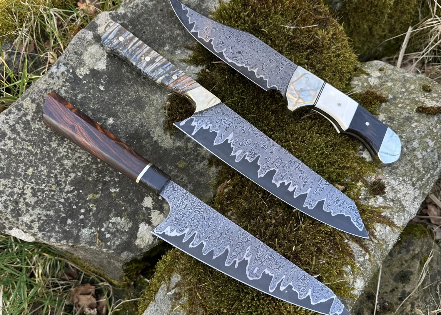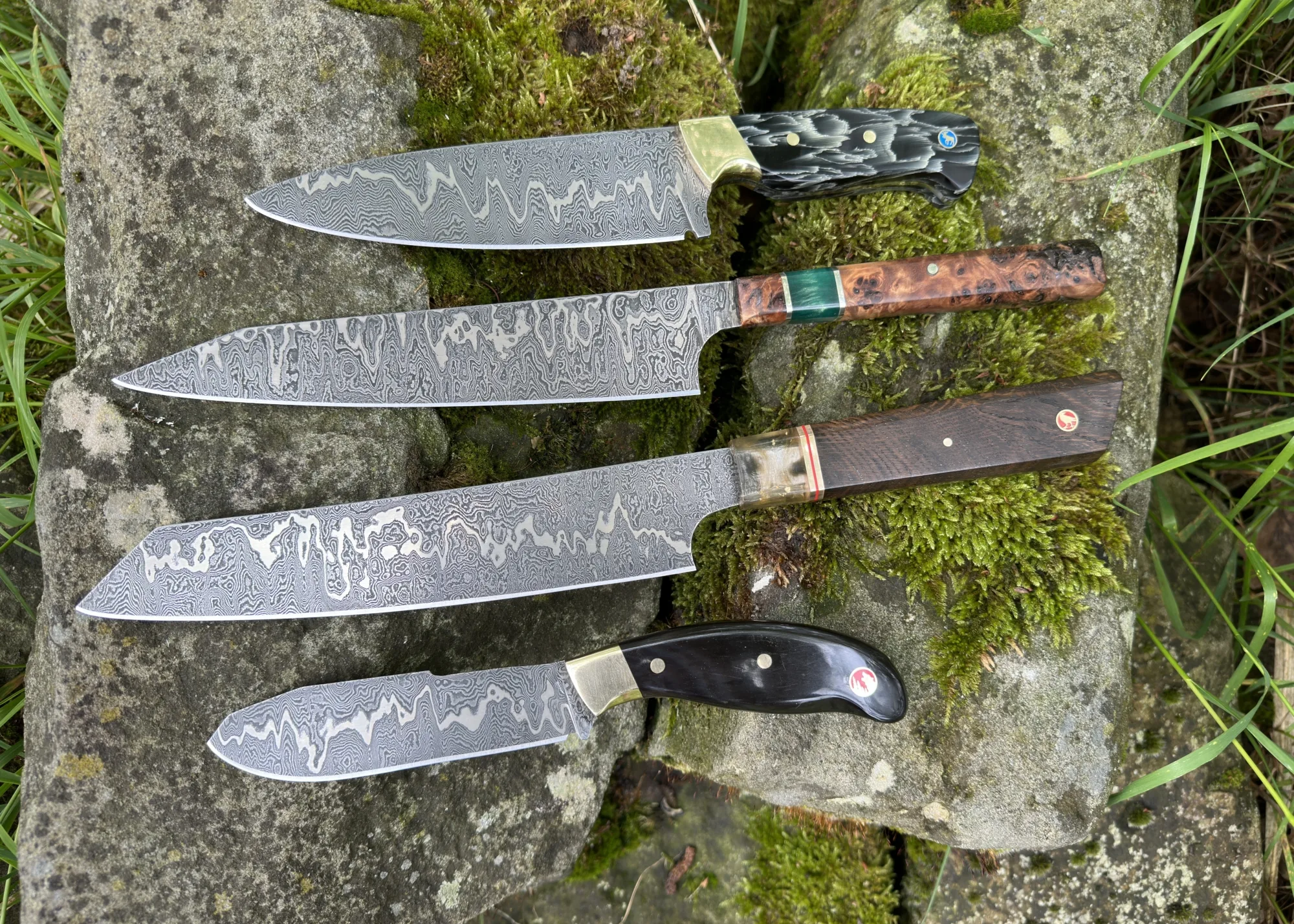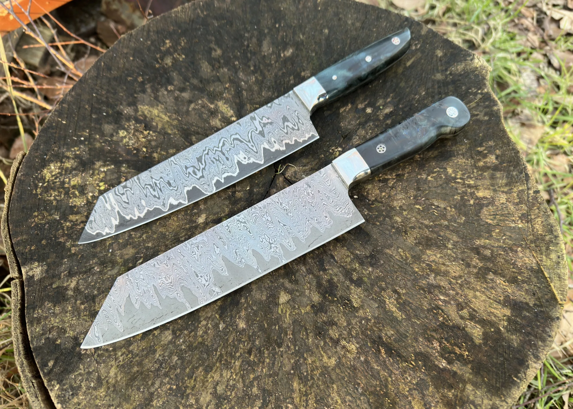 De tweede en eventueel derde dag afhankelijk van de cursus vormen we uw eigen stuk ruwe damast om tot een mes. Eerst tekenen we de vorm van het mes en zagen en slijpen het in de ruwe vorm. Daarna maken we het perfect vlak en op exact de gewenste dikte met behulp van de komslijpmachine. Hierna brengen we met behulp van moderne messlijpmachines het mes in de juiste vorm en slijpen we het lemmet. Met de hand wordt middels vijlen en schuren de juiste finish aan het mes gegeven. Nadat de gaten geboord zijn voor de bevestiging van het handvat voeren we een optimale warmtebehandeling van het staal door. Het mes wordt gehard. Na het harden ontlaten we het staal zodat het taaier wordt. Hierna wordt het mes geëtst waardoor het unieke damastpatroon zichtbaar wordt.