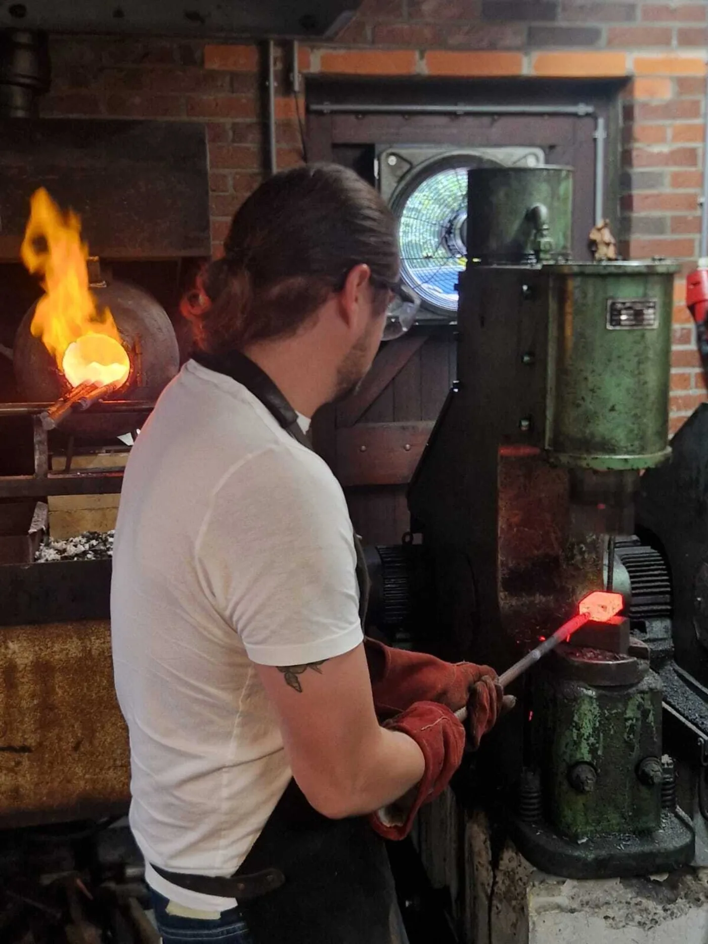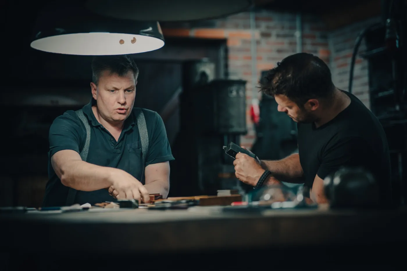 Daarna begint het echte werk en stelt u uw eigen damastpakket samen om deze vervolgens, met behulp van hamer, aambeeld en luchthamer te vuurlassen. Dit pakket vouwen we verschillende keren om te komen tot het gewenste aantal lagen. U beleeft het oude ambacht en de hitte die nodig is om staal te smeden. Het eindresultaat krijgt een laatste warmtebehandeling waarna het gedurende de nacht langzaam afkoelt zodat het de juiste materiaaleigenschappen heeft voor de volgende stappen.