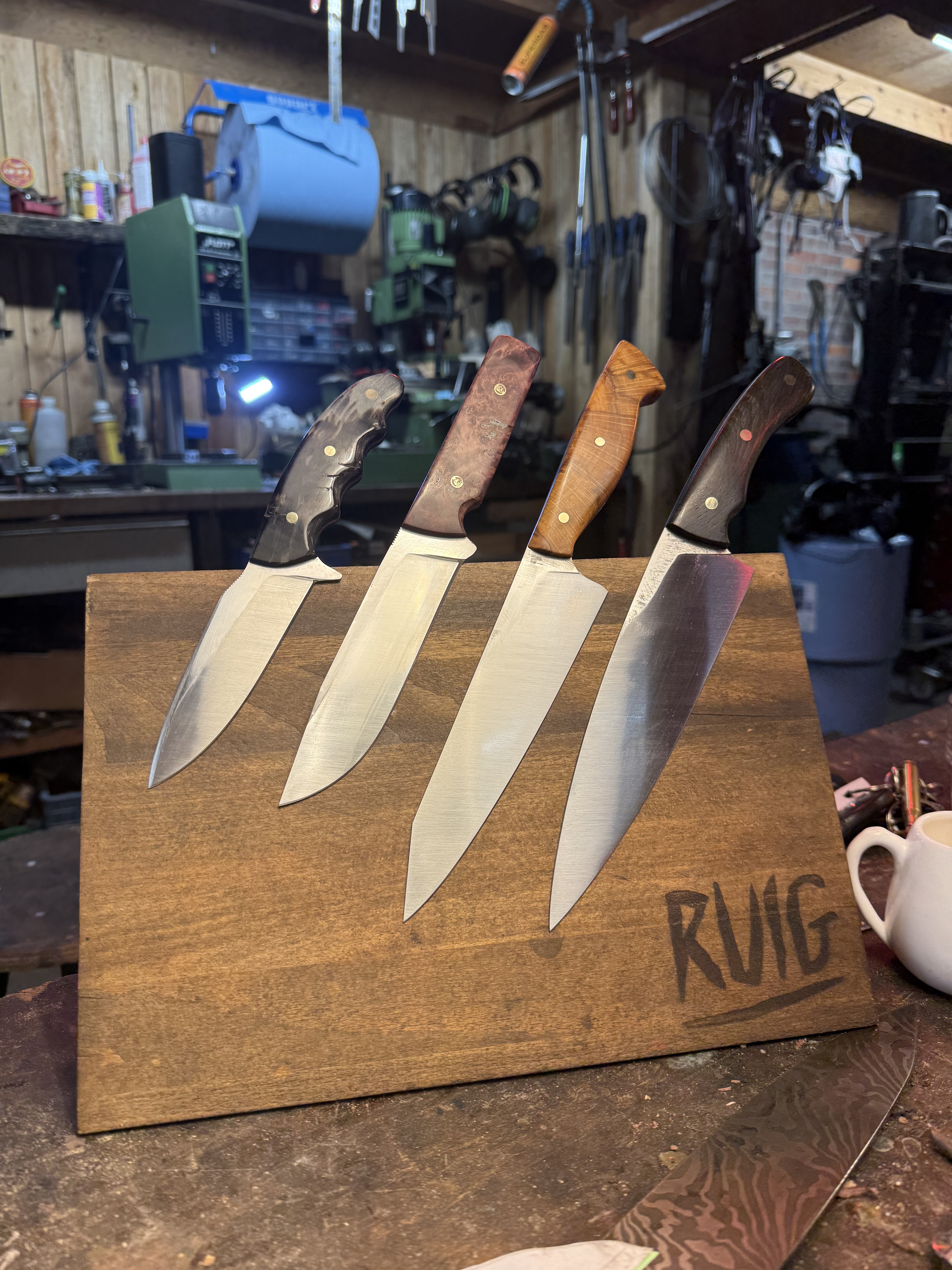Het lemmet wordt machinaal geslepen en met de hand afgewerkt. Daarna verhitten, harden en ontlaten we het staal voor optimale sterkte en taaiheid. Vervolgens monteren, vormen en polijsten we het handvat, zodat de schoonheid van hout of composiet volledig tot zijn recht komt.