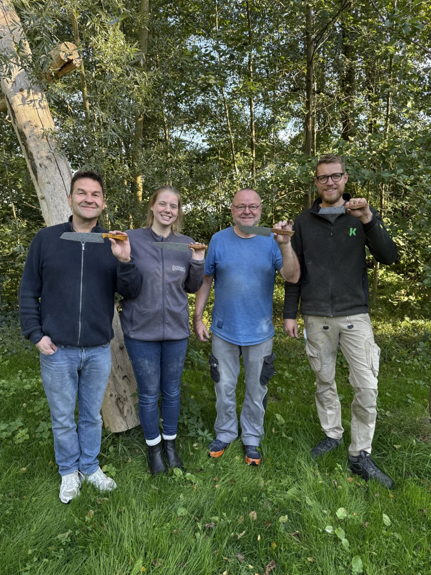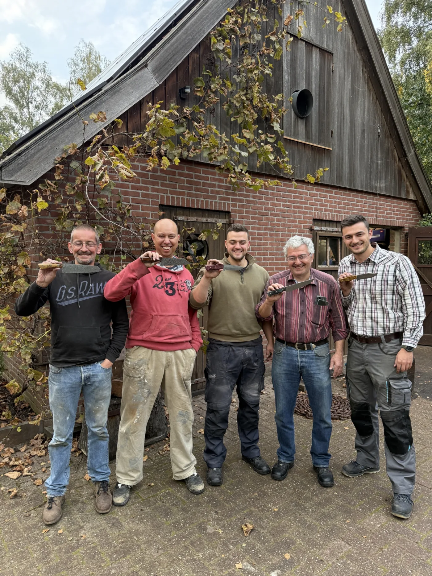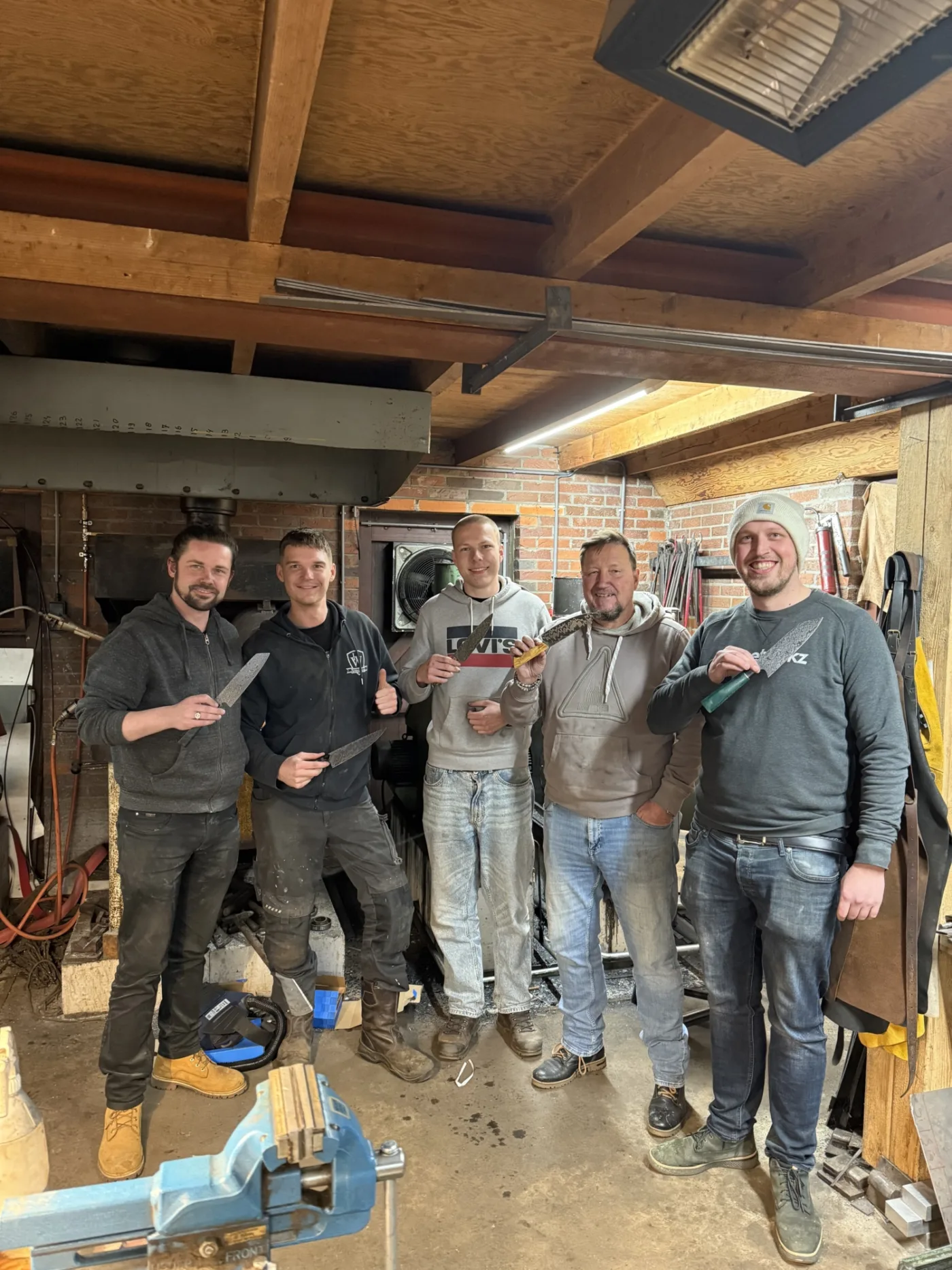 "Ralf, Jan, Martien und ich haben erfolgreich unser erstes Messer bei Ruig in Holland geschmiedet. Unser Ergebniss kann kann sich mehr als sehen lassen. Danke an Gerwin. LG Horst"